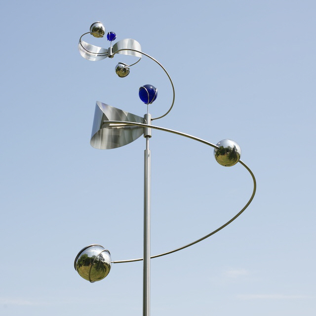 Spiralhöhe 100 cm, Durchmesser 80 cm, Rohrlänge 200 cm plus 50 cm Erdspieß. Farbe der Zentralkugel: blau, grün, rot, klar, Edelstahl.