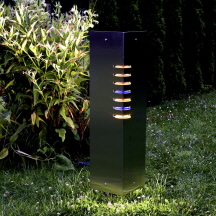 Weitere Ansicht der Stele 4, beleuchtet.Tafelgröße 50x100 cm, 90 Grad gekantet. Farbe der Glasronden: rot, gelb, blau. Erdspiesse 60 cm